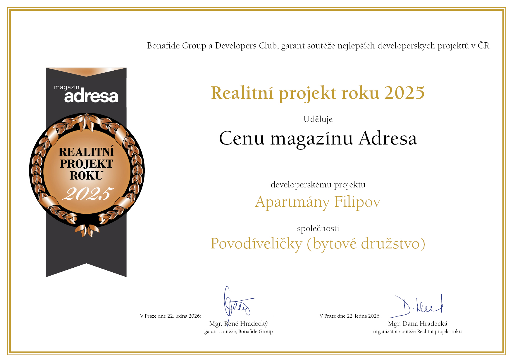 Projekt Apartmány Filipov získal v soutěži Realitní projekt roku 2025 speciální cenu magazínu adresa.cz – respektovaného čtvrtletníku věnujícího se architektuře, realitám, developmentu a rozvoji měst, který představuje inspirativní projekty i osobnosti z Česka i ze zahraničí.