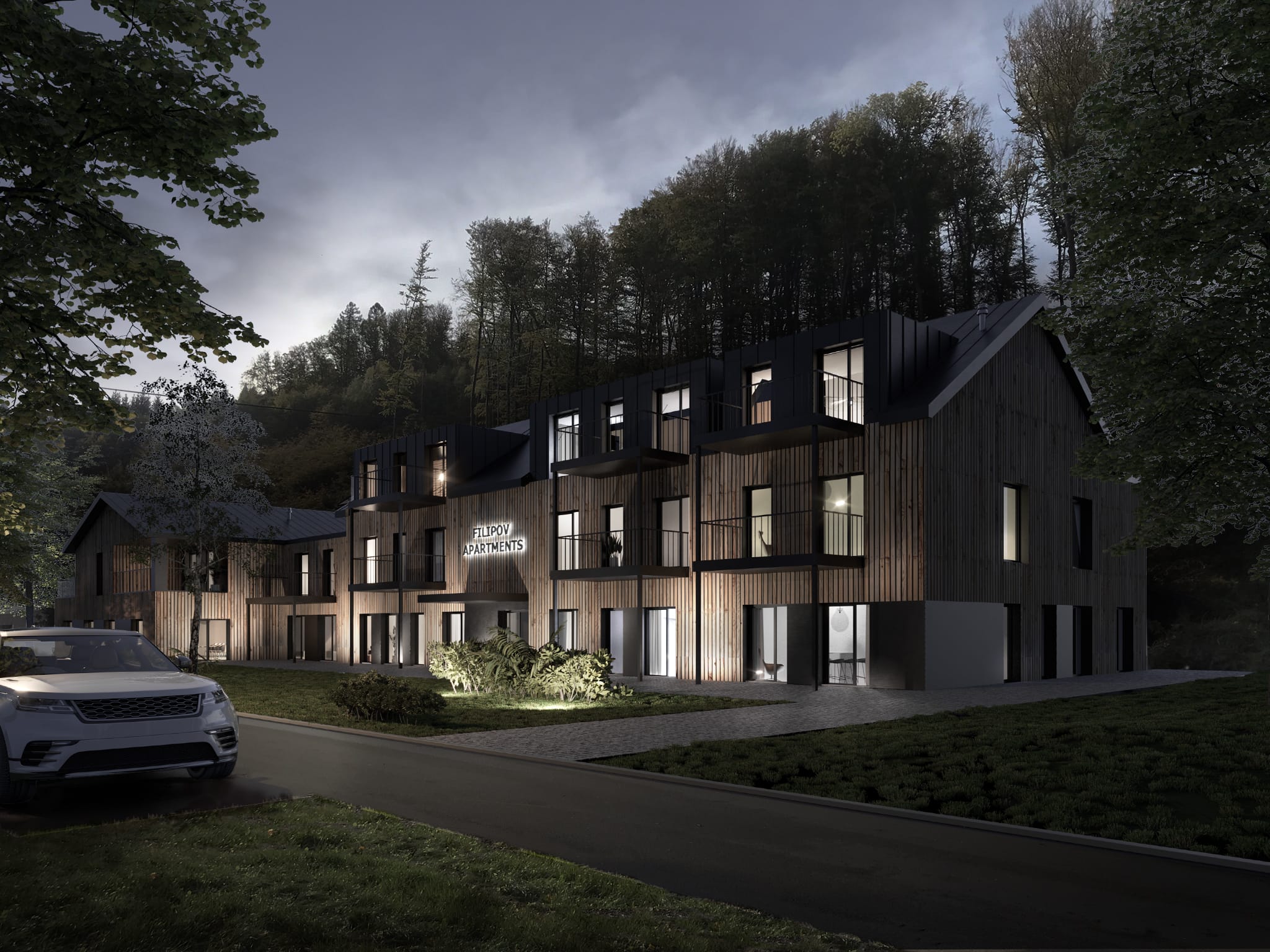 Každý apartmán je vybaven balkonem, který nabízí krásný výhled do okolní přírody. Balkony jsou navrženy tak, aby poskytovaly ideální místo k relaxaci, kde si můžete vychutnat čerstvý vzduch a pohled na les, který obklopuje celou lokalitu. Ranní káva nebo večerní posezení s přáteli získá na balkonu zcela nový rozměr. Tato oáza klidu propojuje vnitřní prostor apartmánu s okolní přírodou a přináší pocit soukromí a harmonie.